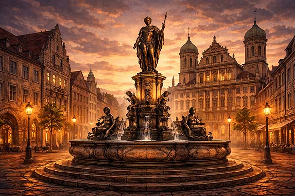 DDenn tief unter den Pflastersteinen liegt das Herz der einstigen römischen Provinzhauptstadt Augusta Vindelicum – gegründet um 15 vor Christus, benannt nach Kaiser Augustus, der diesen Ort an Lech und Wertach zur mächtigsten Römerstadt südlich der Donau aufsteigen ließ. Forum, Tempel, Thermen und Markthallen prägten einst dieses Zentrum – von denen heute kaum ein Stein mehr sichtbar ist. Fast 1.600 Jahre später beschloss die Stadt, ihrem Gründer ein würdiges Denkmal zu setzen. Zur 1600-Jahr-Feier Augsburgs entstand zwischen 1588 und 1594 der Augustusbrunnen, geschaffen vom niederländischen Bildhauer Hubert Gerhard. In der Mitte steht der Stadtgründer Augustus als Friedenskaiser, umgeben von vier Flussgöttern, die Augsburgs Hauptgewässer versinnbildlichen: Lech, Wertach, Singold und den Brunnenbach. Seit 2019 gehört der Brunnen als Teil des Augsburger Wassermanagement-Systems zum UNESCO-Welterbe. Ein Platz, ein Brunnen – und darunter: zweitausend Jahre, die nie ganz verstummt sind.